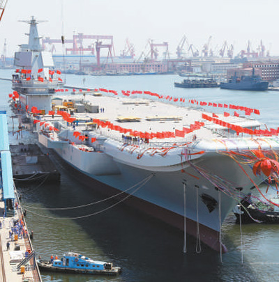我国第一艘国产航母在大连造船厂码头下水现场图。 新华社记者 李 唐摄 |