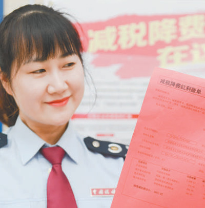 福建省泉州市惠安县税务局工作人员展示减税降费红利账单。 新华社记者 宋为伟摄 |
