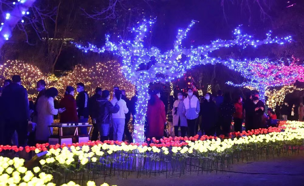 春节期间,夜幕下的金城公园入口、园路、亭台廊榭花灯绽放,璀璨夺目。满天星、流星雨等造型的灯串和灯具,巧妙地妆点着公园里的树木和建筑,呈现出火树银花不夜天的美景。