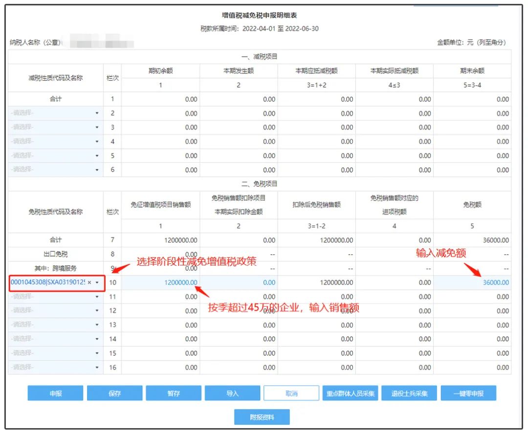 关注点2:如果小规模纳税人按季度申报,销售额未超过45万元,则在主表11栏“未达起征点销售额”或“小微企业免税销售额”填写。超过45万元的,先在《增值税减免税申报明细表》免税项目中选择减免性质、填写减免销售额和减免税额,在主表12栏“其他免税销售额”中体现。