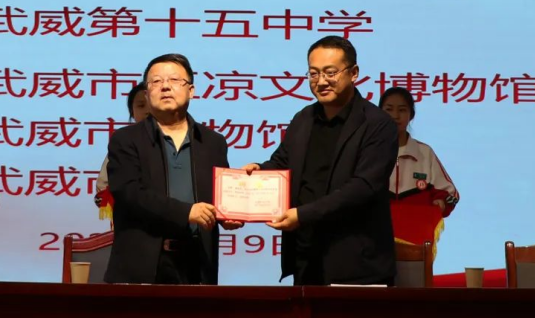 当日,武威第十五中学与武威市博物馆、武威市五凉文化博物馆、武威市西夏博物馆签订《馆校合作共建协议》。为建立健全馆校合作长效机制,推动博物馆教育与学校教育的有机融合,学校发布了《武威第十五中学关于聘请黎树科等5名同志担任少先队校外辅导员的决定》并为受聘辅导员颁发“少先队校外辅导员”聘书。
