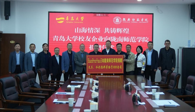 10月14日,青岛大学副校长刘恩贤代表青岛大学校友企业向陇南师范学院捐赠水彩颜料、铅笔蜡笔、绘画纸等教学物资1000余箱,价值人民币1000余万元。陇南师范学院党委书记张弢接受捐赠。青岛科大华鲁科技有限公司、青岛华联建筑科技集团有限公司、青岛地铁商贸有限公司、青岛鸿诚源经贸有限公司等青岛大学校友企业代表,学校领导、相关部门负责人参加捐赠仪式。