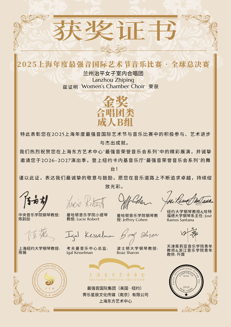 此次金奖殊荣,不仅是对兰州治平女子室内合唱团艺术实力的权威肯定,更是对团队不懈追求音乐梦想的最佳见证。她们以歌声传递爱与希望,用音乐搭建跨文化沟通桥梁,让世界清晰听见来自兰州的声音,更让中国西北传统音乐文化在国际舞台上焕发光彩。