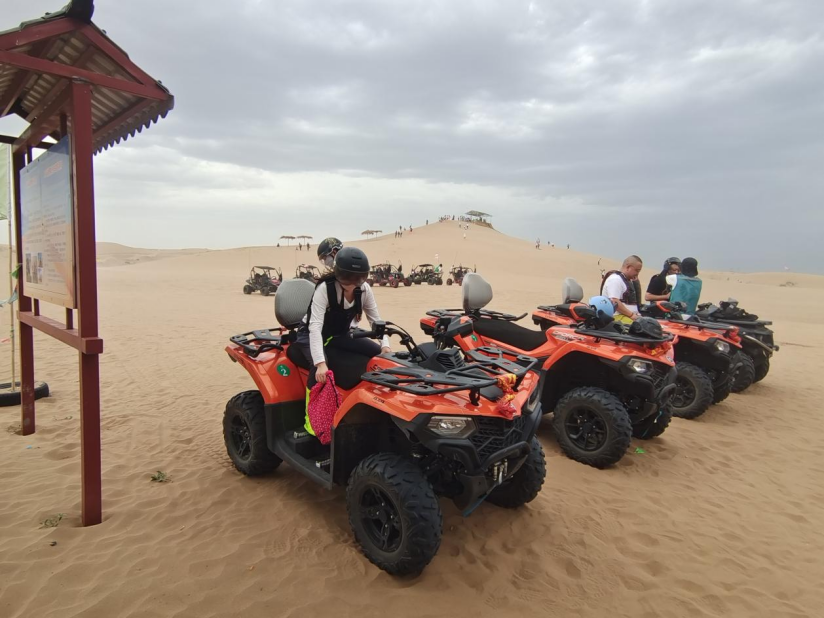 景区距武威东站仅二十五分钟车程,却仿佛一步踏入另一重时空。浩瀚无垠的沙海起伏如涛,沙壑纵横,梭梭、花棒在风中共舞,苍凉与生机同框。黎明,冲浪越野车咆哮出阵,沙脊在轮胎下崩裂成金雾;卡丁车赛道尘土飞扬,年轻的心跳与沙丘共振。滑沙场传来童声尖叫,滑板一瞬千里;长长的骆驼队缓步穿越“九道槽”,驼铃声声与长城烽燧剪影,把历史拉回到张骞凿空西域。