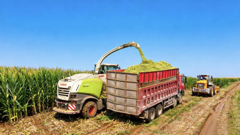 伴随着机器的轰鸣声,收割机的锋利切割装置快速掠过玉米秸秆,将青贮玉米连茎带穗精准卷入机身。机身内部,粉碎、揉搓装置高速运转,原本粗壮的玉米秸秆顷刻间被加工成细碎均匀的青贮饲料,顺着出料口源源不断地撒落入一旁等候的运输车厢。