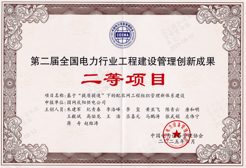 9月16日,从中电联处获悉,国网庆阳供电公司申报的《基于“提质提速”下的配农网工程组织管理新体系建设》项目,在全国众多优秀作品中脱颖而出,成功荣获二等项目。