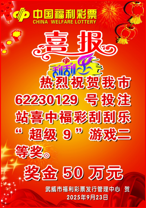 9月的武威彩市,大奖喜讯频传,彩民好运不断!9月22日,位于武威市凉州区南苑小区西侧的62230129号投注站传来大奖喜讯,一位彩民喜中刮刮乐“超级9”游戏二等奖,斩获奖金50万元。
