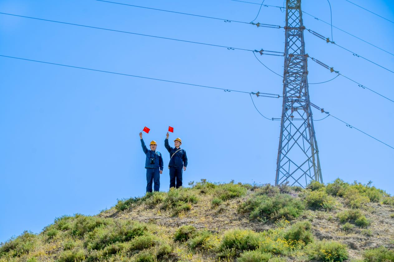 国网白银供电公司员工在巡线现场与国旗合影 以最挺拔的姿态向祖国致敬 祝祖国繁荣昌盛 查代辉 摄