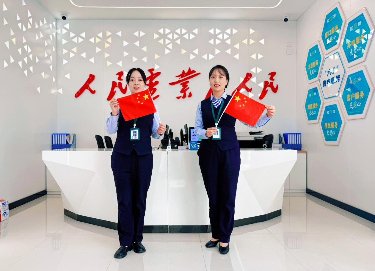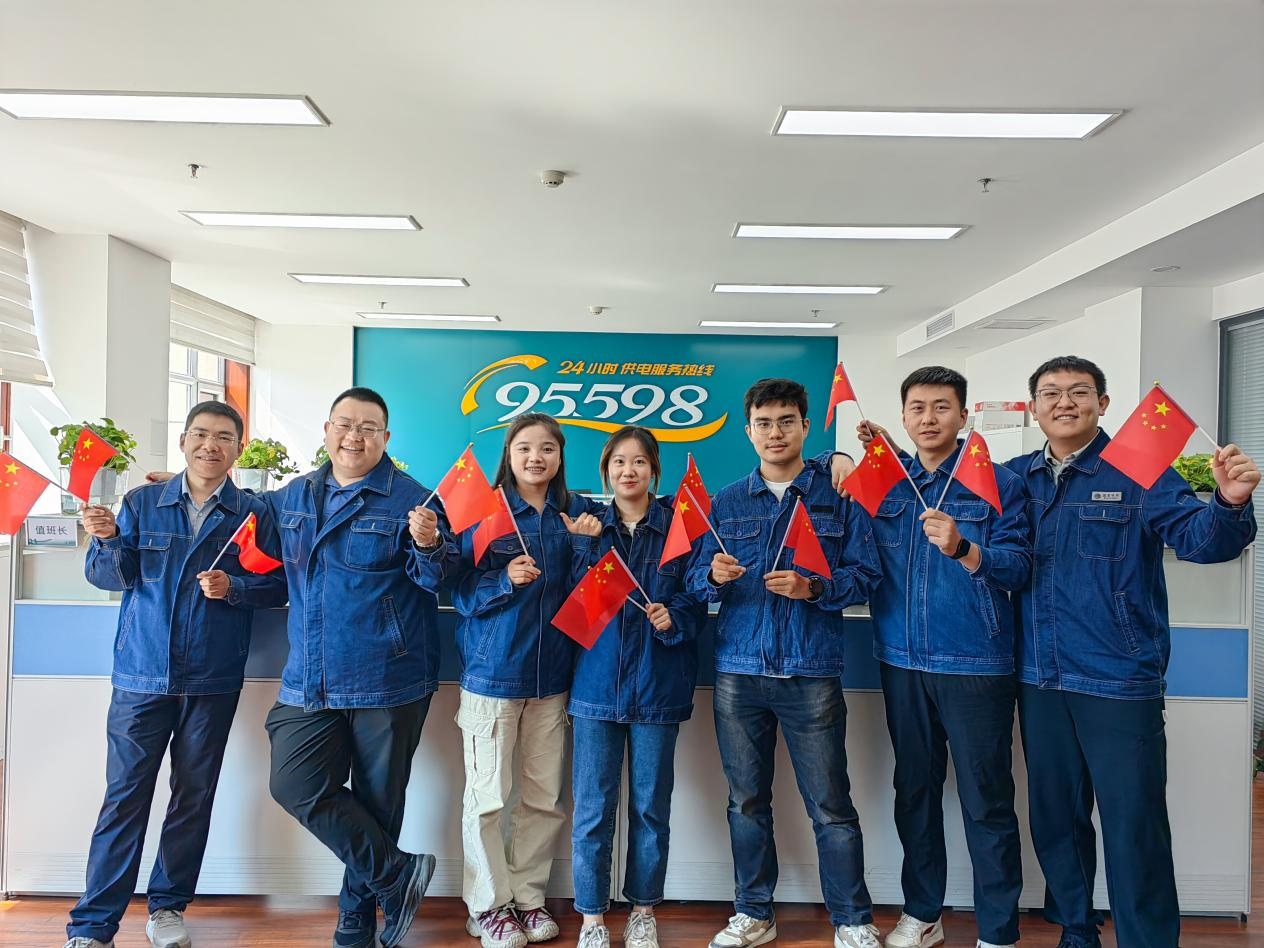 国网张掖供电公司员工们在繁忙的工作间隙与国旗合影 向祖国母亲献上最深情的祝福 程刚 摄