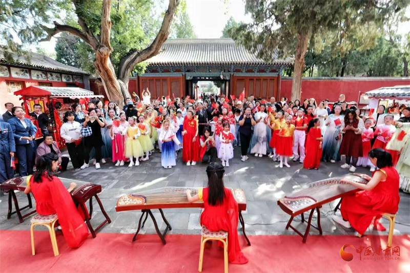 武威文庙景区内游客们手持国旗聆听古乐
