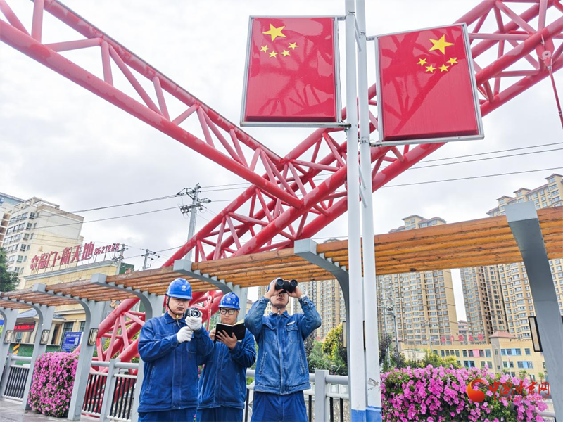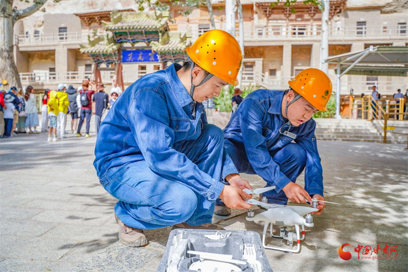 国网酒泉供电公司员工在莫高窟景区对用电设施进行巡视检查,全力保障“双节”期间旅游景点可靠用电。尚丽娜 摄