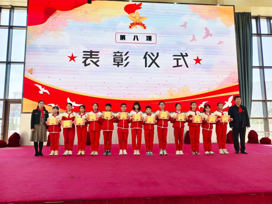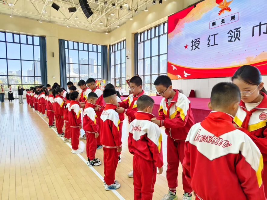 活动核心环节聚焦“传承”与“荣誉”。一方面,为二年级458名新队员举行入队仪式,高年级优秀少先队员代表手持红领巾,认真细致地为每一位新队员佩戴,当鲜红的红领巾在新队员胸前飘扬时,新老队员互敬队礼,这一刻不仅是身份的转变,更是革命精神的接力、新时代希望的点燃;另一方面,现场授予15名少先队员“优秀大队干部”荣誉称号,以榜样力量激发全体队员的进取意识。