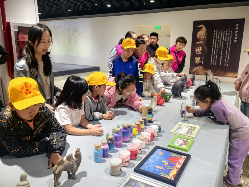 研学首站,“爱心妈妈”和孩子们一同走进敦煌文博主题展。孩子们凝神观看,认真聆听,眼中充满了对历史知识的渴望与惊叹,灿烂的中华文明在他们心中刻下了深刻的印记。在随后的动态沙画与沙瓶画体验环节,在专业老师指导下,“爱心妈妈”与孩子们结对合作,共同创作。