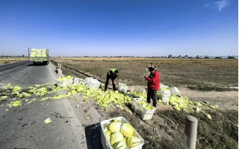 当日,一辆满载蔬菜的货车行驶至乡间公路时,因车厢未封牢,大量白菜连筐翻落在路面及农田边缘。就在司机一筹莫展之际,永昌公安朱王堡派出所的巡逻民辅警恰好途经此处。看到现场白菜散落一地,民警立即停车,快步上前安抚司机:“别慌,我们帮你一起捡!”话音刚落,民警便俯身蹲在路边,化身“临时搬运工”,投入到蔬菜整理工作中。
