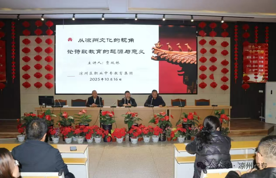中国甘肃网10月22日讯(西北角·中国甘肃网记者 张振国)近日,凉州区职业中专教育集团在本校举办别开生面的校园诗教读书分享会,全校师生五百多人参加了读书交流活动。分享会特邀甘肃省作家协会会员、武威市凉州文化研究院兼职研究员、该校教师贾双林主讲。分享会以凉州文化为切入点,带领在场师生开启了一场跨越千年的诗歌教育历史溯源之旅。