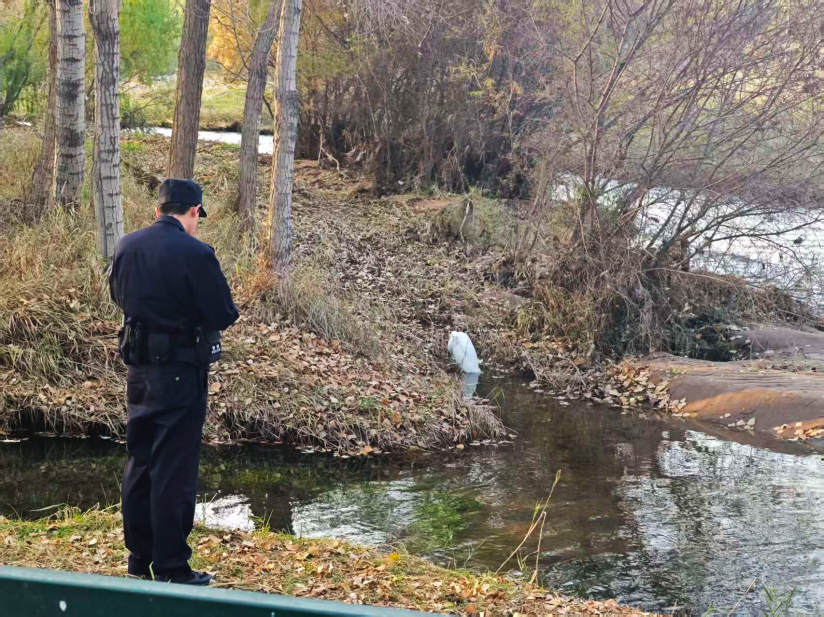 当日,永昌公安城关派出所巡逻组在城郊河道处发现一只蜷缩在岸边的白鹭无法正常飞行。