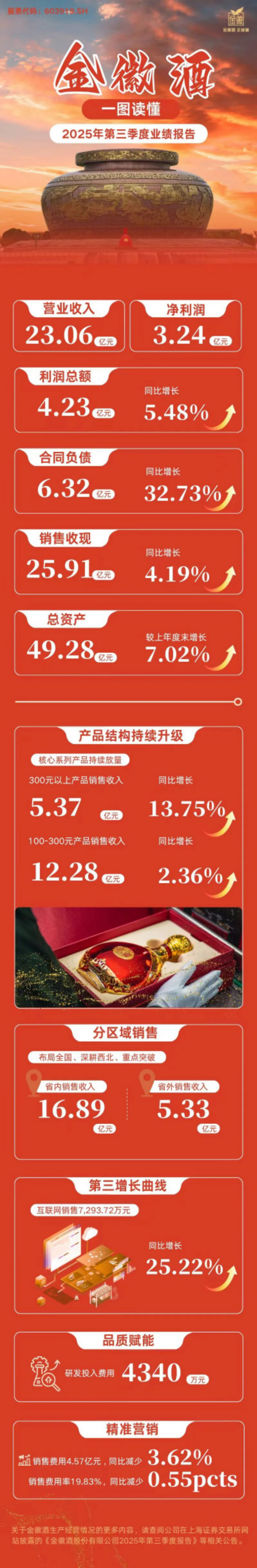 10月24日,金徽酒发布2025年三季报,前三季度公司实现营收23.06亿元;净利润3.24亿元。其中300元以上、100-300元档位产品报告期内营收分别增长13.75%、2.36%。