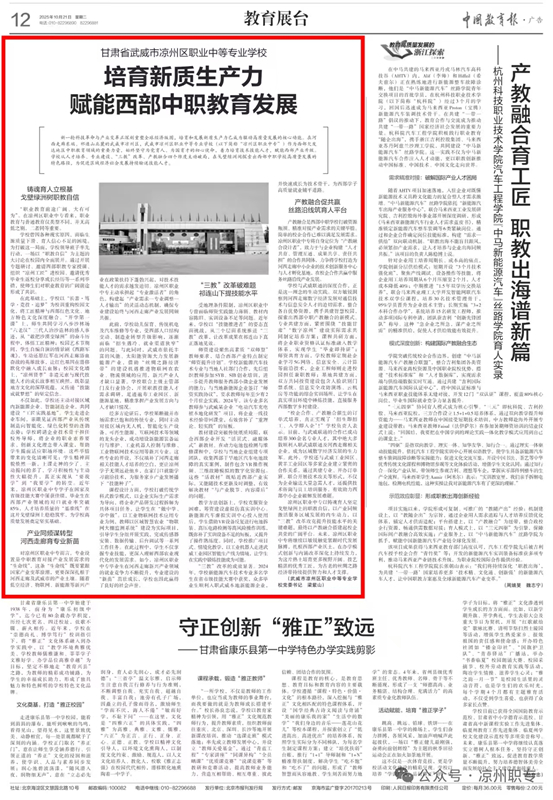 中国甘肃网10月27日讯(西北角·中国甘肃网记者 张振国)记者从凉州区职业中专教育集团获悉,10月21日,由该校党委书记梁紫山撰写的《新质生产力赋能西部中职教育高质量发展——武威市凉州区职业中等专业学校的创新实践》一文,在国家级权威媒体《中国教育报》刊发,西部中职教育“凉州样板”引发全国关注。这是国家层面对凉州区职业中专扎根河西走廊、创新发展中职教育的高度认可,更是西部地区职教成果走向全国的重要标志。