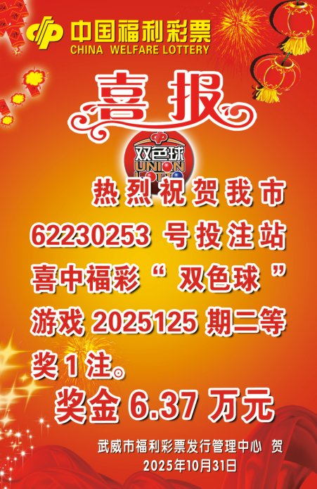 武威彩市好运连连,喜事不断!10月30日晚,中国福利彩票“双色球”游戏第2025125期开奖,开出红球号码为03、09、12、13、26、32,蓝球号码为09。开奖结束后,位于武威市凉州区皇台一区7号楼的62230253号投注站传来大奖喜讯,一彩民凭借一张14元“7+1”复式彩票,一举摘得“双色球”游戏二等奖1注,收获奖金6.37万元。