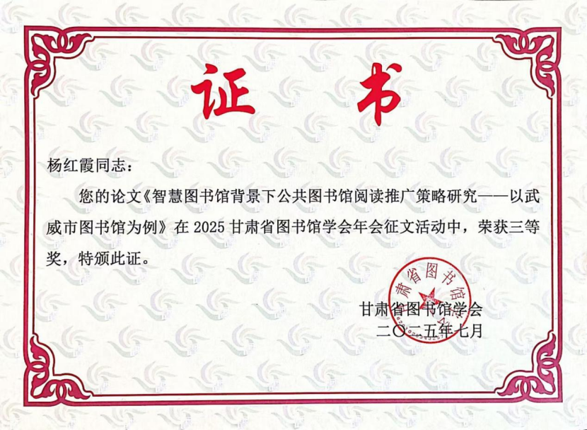中国甘肃网11月7日讯(西北角·中国甘肃网记者 张振国)近日,由武威市图书馆馆员杨红霞撰写的论文《智慧图书馆背景下公共图书馆阅读推广策略研究——以武威市图书馆为例》,在2025甘肃省图书馆学会年会征文活动中荣获三等奖,为公共图书馆工作高质量发展提供了宝贵的理论参考。