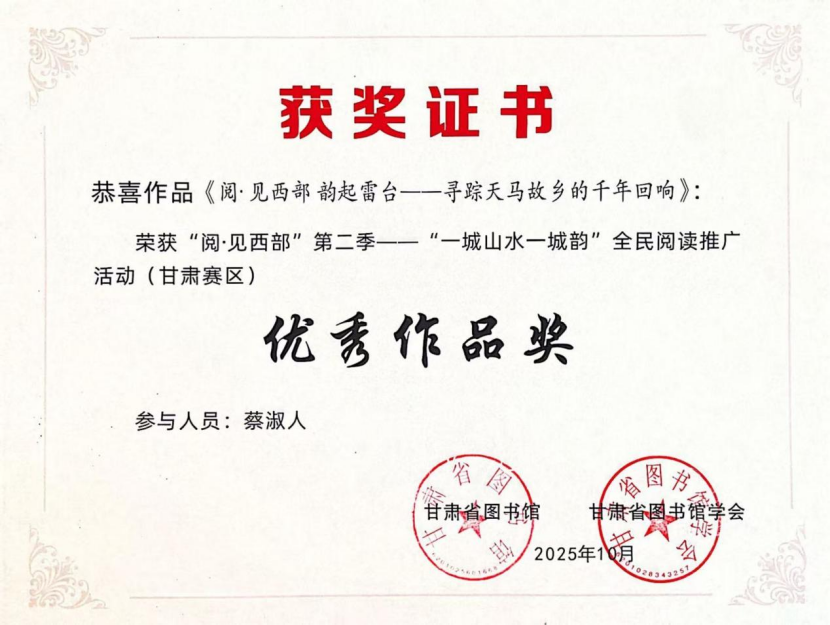 同时,武威市图书馆选送的作品《阅·见西部 韵起雷台——寻踪天马故乡的千年回响》荣获“阅·见西部”第二季——“一城山水一城韵”全民阅读推广活动(甘肃赛区)优秀作品奖。