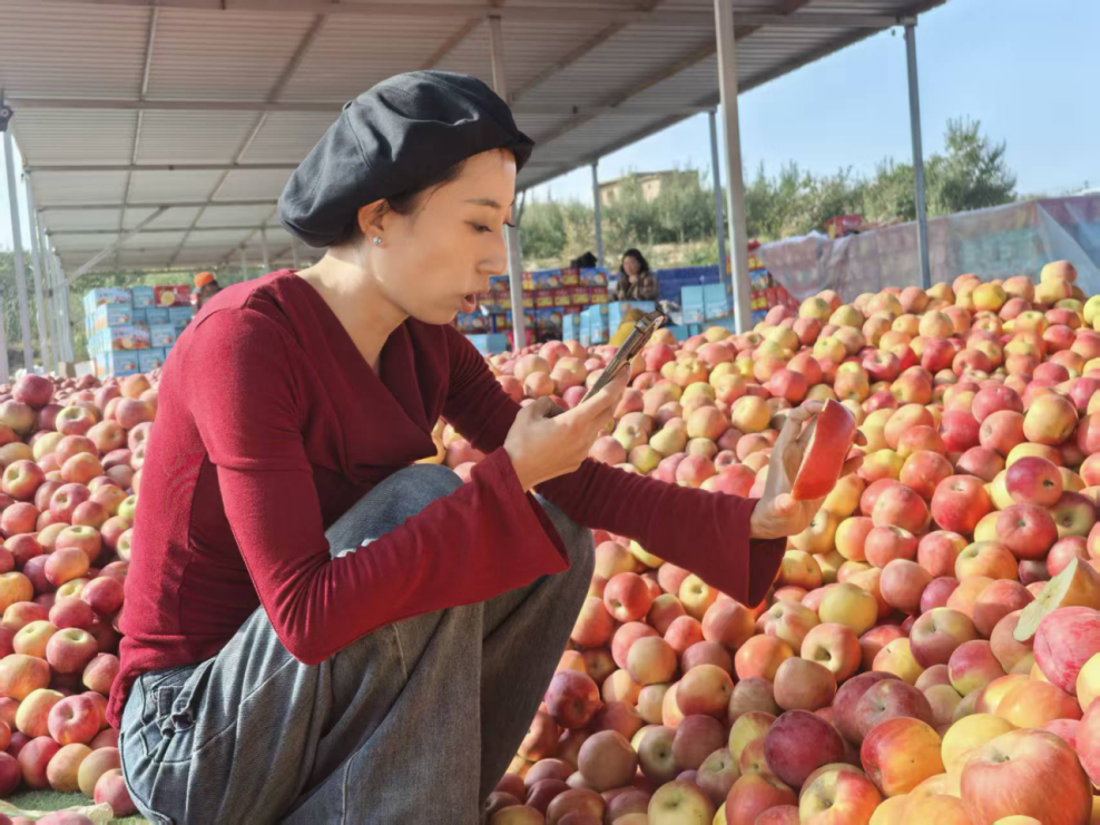 “家人们看过来,我们靖远山美水美,种出来的苹果脆得带响、甜得入心……”镜头前,杨凤笑容灿烂。