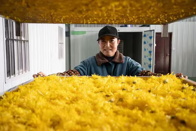“采摘后的金丝皇菊要一朵朵平整码在晾盘里,阴干7天再进烤房,55至60度恒温烘干7天,前后半个月才能打包。这样既留住菊香,又保住金黄色泽,一朵批发价1元,一亩地年产值能达1万元!”11月11日,甘肃省白银市白银区强湾乡白崖子村村民高启文,指着阴房里层层竹筛上的金丝皇菊,细数这“论朵卖”背后的精细加工流程。