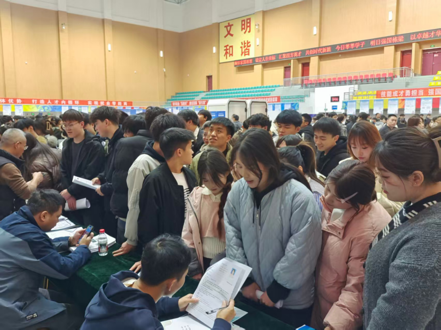 11月13日,校园招聘会在该校体育馆举行。体育馆内人头攒动,紧张有序,交谈、了解、签约……现场招聘,就业咨询,签约服务。2026届毕业生、用人单位、各学院党政负责同志及辅导员、毕业班班主任共赴盛会,为一颗颗怀揣梦想的心绘就一幅幅走向未来的蓝图。