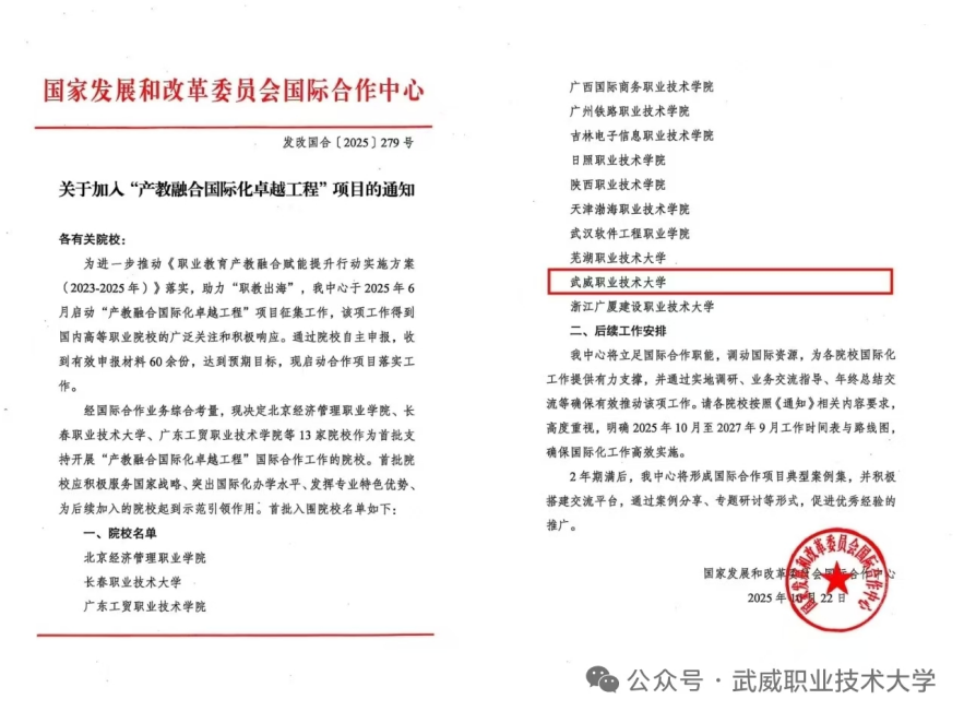 中国甘肃网11月18日讯(西北角·中国甘肃网记者 张振国)近日,国家发展和改革委员会国际合作中心《关于加入“产教融合国际化卓越工程”项目的通知》正式发布,武威职业技术大学成功入选首批合作院校名单,为甘肃省唯一入选院校,标志着该校在国际化办学与产教融合迈入国家支持的新发展阶段。
