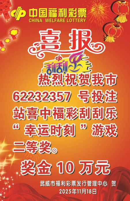 福彩迎好运,指尖刮惊喜。11月18日,武威市古浪县黄花滩绿洲小区的62232357号投注站传来喜讯,彩民王先生(化名)凭借对福彩的长期支持与对公益的执着坚守,喜中“幸运时刻”二等奖10万元,实现了爱心与幸运的双向奔赴。