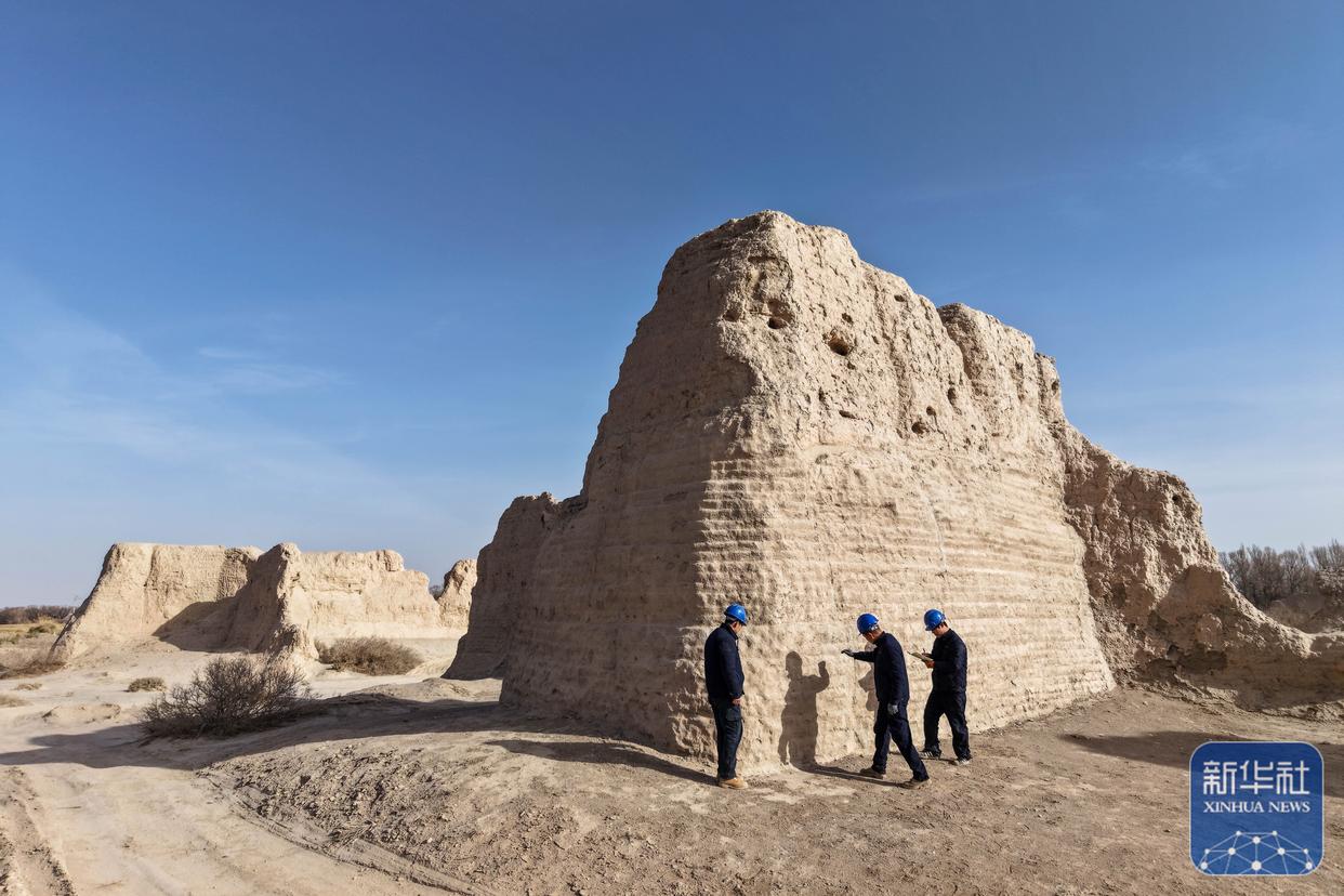 ↑ 11月18日,敦煌研究院文物保护技术服务中心工作人员观察西墙马面的夯筑支顶加固效果(无人机照片)。新华社记者 郎兵兵 摄