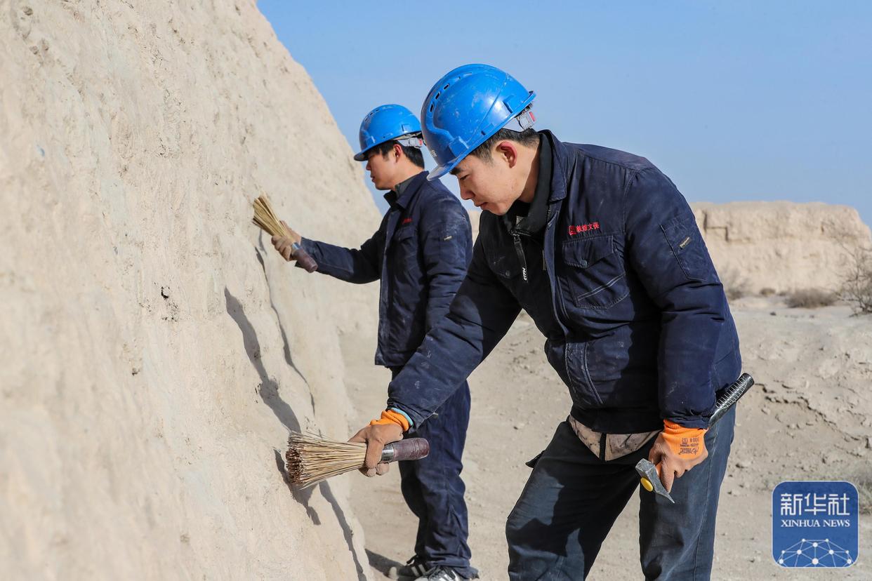 ↑ 11月18日,敦煌研究院文物保护技术服务中心工作人员利用刷子对夯筑面进行修整,使其更好地与遗址墙体保持一致。新华社记者 郎兵兵 摄
