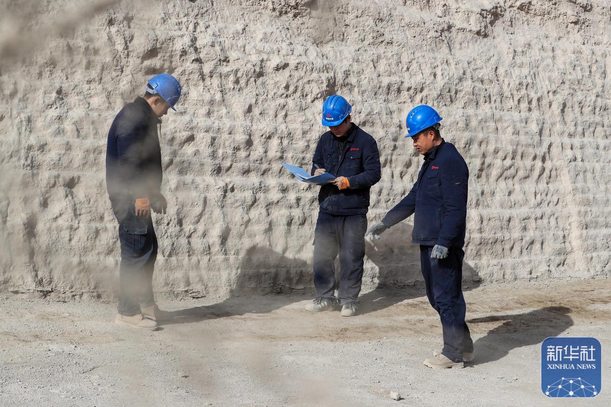 ↑ 11月18日,敦煌研究院文物保护技术服务中心工作人员在观察西墙墙基排水处理效果。新华社记者 郎兵兵 摄