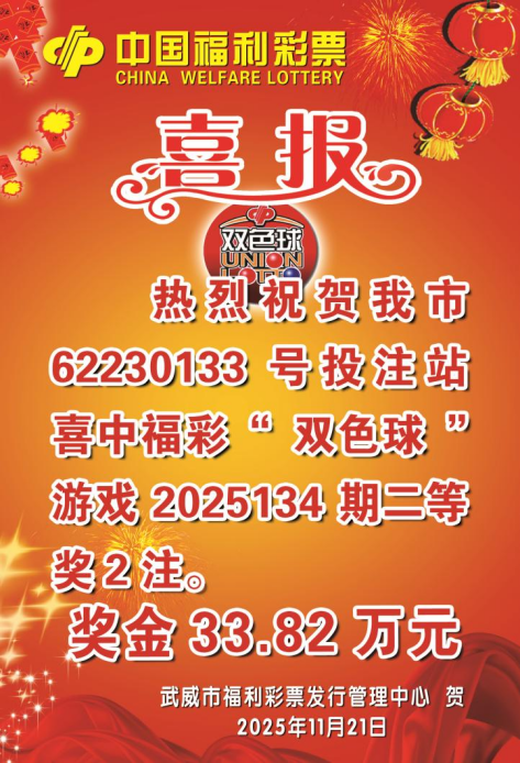 11月20日,福利彩票“双色球”游戏第2025134期开奖,开出红球号码:3、5、9、13、26、29,篮球号码:12。开奖结束后,位于武威市凉州区共和街西口62230133号福利彩票投注站传来大奖喜讯,一位彩民凭借一张4元单式彩票,幸运斩获“双色球”游戏二等奖2注,收获奖金33.82万元。