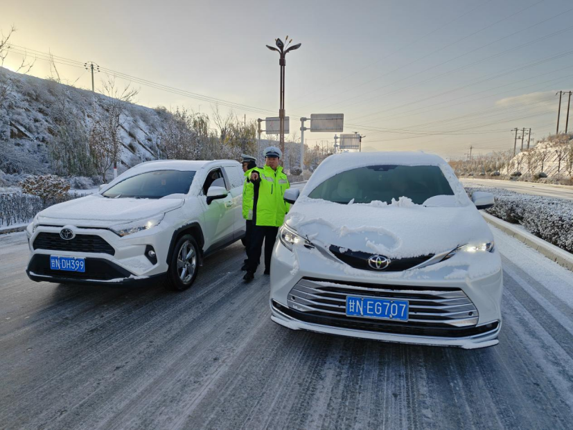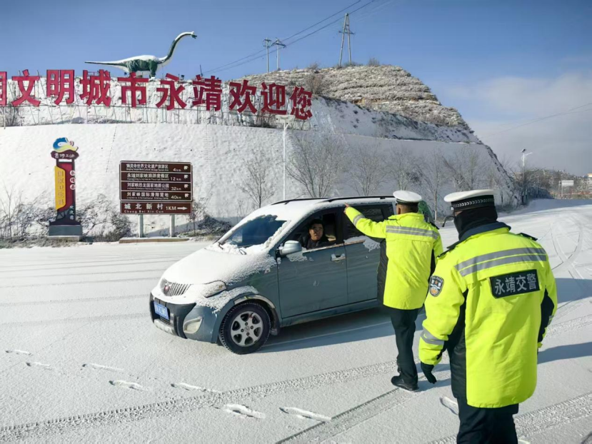 11月24日,受寒潮天气影响,甘肃省永靖县出现降雪,积雪深度2~7厘米,给群众出行带来不便,为做好道路交通安全工作,永靖县公安局交管大队、各派出所启动雪天道路交通管理应急预案,加强路面巡查宣防工作,全力以赴清路障、排隐患、保畅通,督促、协助驾驶员做好防滑措施,并为受困车辆提供救助服务。