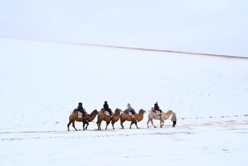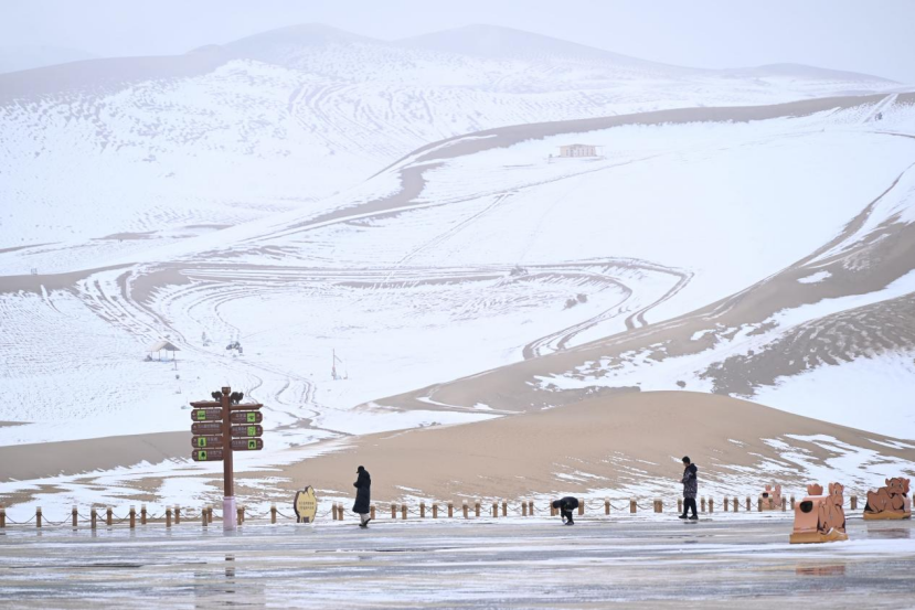受冷空气东移影响,11月23日甘肃省敦煌市迎来今年立冬以来首场降雪。当地著名景点鸣沙山月牙泉银装素裹,景色如画,美不胜收。(文/图 张晓亮)