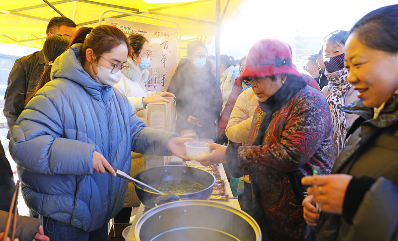 匠心传韵,非遗民俗焕发时代生机。“非遗活态坊”使指尖技艺与乡土乡愁碰撞出别样火花,刺绣、剪纸、麦秆画等非遗传承人现场展示、制作文创产品,精致手工艺品让群众爱不释手。“墨香送福来”书画雅集区,书法协会会员挥毫泼墨,一幅幅春联、“福”字免费赠予群众,墨香中传递文化传承力量。“情暖冬日·味享民乐”民俗体验区,餐饮商会厨艺能手带领群众制作传统美食,刚出锅的羊杂、糕卷等特色小吃香气四溢,大家分享品尝,在味蕾享受中感受“幸福团圆”的温馨氛围。