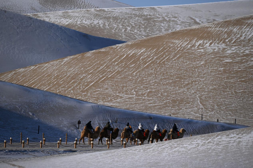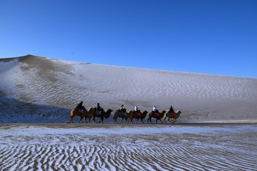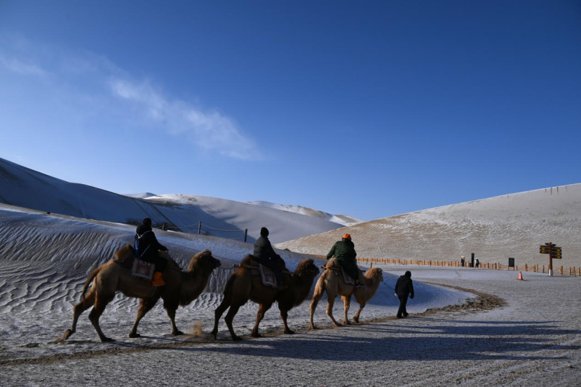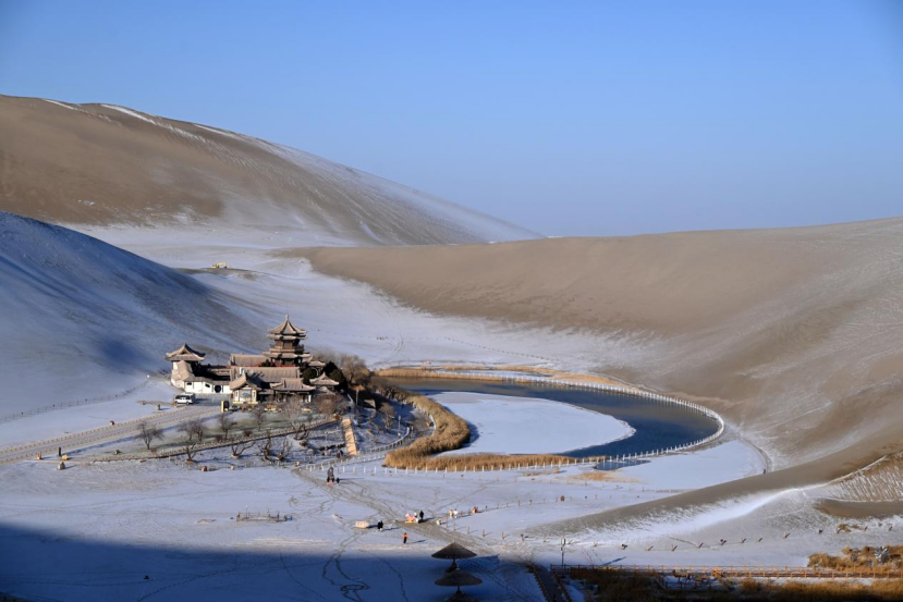 受新疆强冷空气东移影响,12月11日,甘肃省敦煌市出现降雪天气。雪后的敦煌市鸣沙山月牙泉景区景色迷人,宛如画卷,美不胜收。(文/图 张晓亮 朱静)