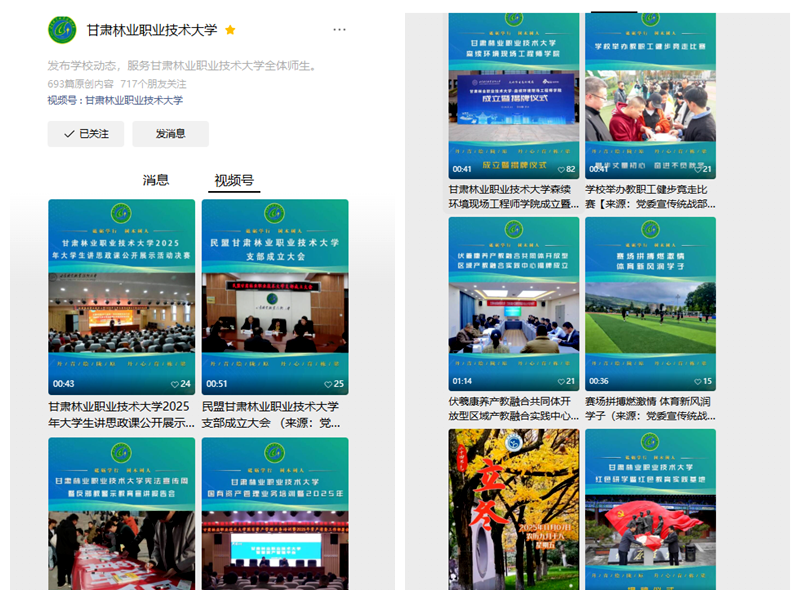 创新传播方式方法,丰富宣传内容载体。顺应新媒体传播规律与发展趋势,着力构建多元化、立体化宣传矩阵。在微信公众号深耕优质原创内容,打造高质量原创作品56部,发布涵盖校园热点、师生风采、办学成就、政策解读等领域的各类推文482篇;在微信视频号发力可视化传播,拍摄发布生动鲜活、富有感染力的视频消息103条,以直观生动的形式全景式展现学校办学风貌与特色亮点。通过多形式、多维度的宣传呈现,让“甘林故事”更具温度、“甘林声音”更具穿透力,学校的知名度和美誉度得到显著提升。