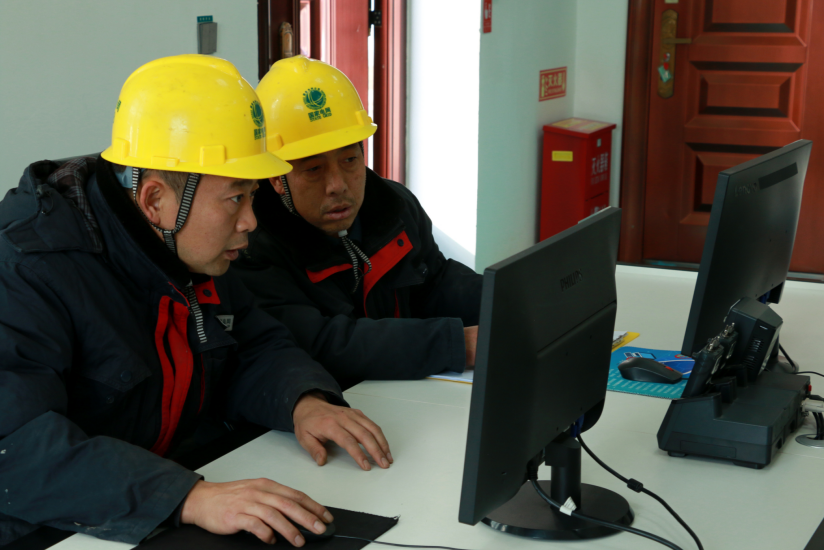 陇南西和县供电公司变电运维班员工陈请示、胡昊在35千伏鲍河变电站主控室查看设备运行数据
