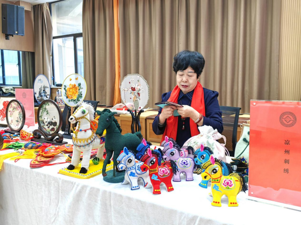 “非常荣幸受区文化馆邀请,参加2026‘非遗贺岁·骏彩迎新’的非遗创作展示活动。”凉州结绳区级代表性传承人吕玲玲一边展示,一边介绍:“今天给大家带来的两款产品是马年吉祥物产品,一款是车挂,另外一款是马年绣片。希望大家在新的一年里马到成功、吉祥如意,也希望我们继续把非遗传承下去。”