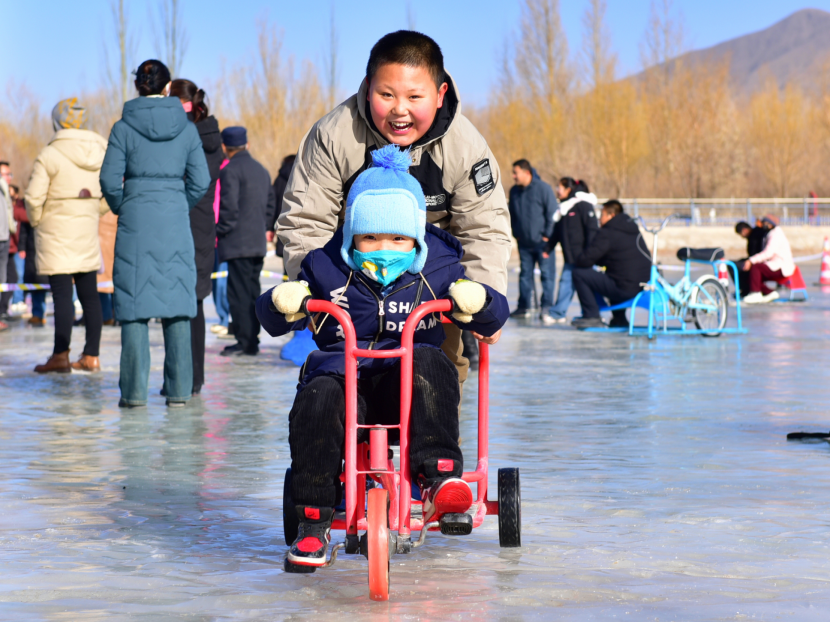 1月15日,肃北县举办2026年“雪域欢腾 冰趣飞扬”冰雪趣味活动。活动现场氛围热烈,居民齐聚冰湖,共同沉浸于欢乐的冰雪世界。活动现场,冰上拔河、冰车接力赛、冰上龙舟赛、冰上双人自行车速度赛、双人龙舟速度赛、冰上保龄球、冰上障碍赛等项目竞相开展。(文/图 张娅妮 陈天良)