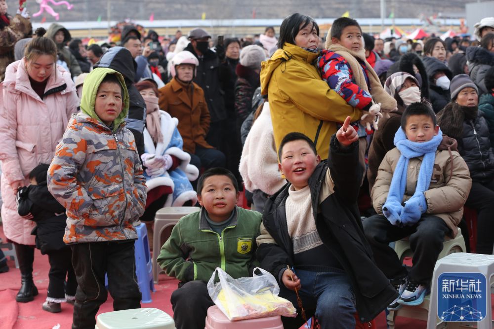 ▲几位小朋友在年货大集上观看秦腔非遗演出(1月19日摄)。新华社发(王克贤 摄)