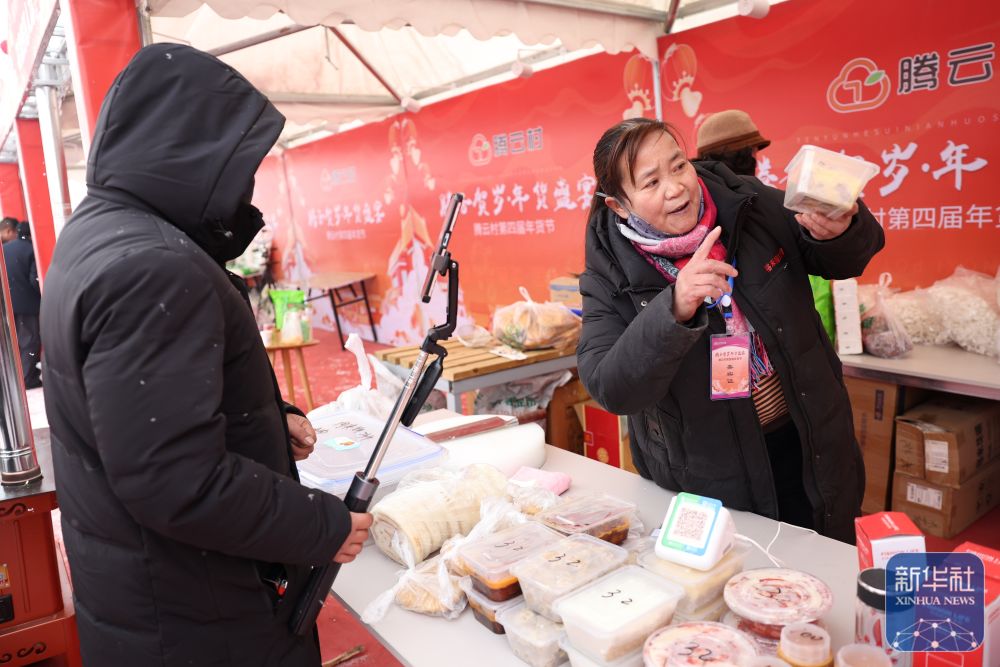 ▲一位摊主在年货大集上和自媒体博主一起推介当地特色农产品(1月19日摄)。新华社发(王克贤 摄)