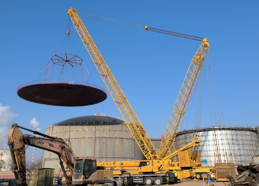 1月26日,在油品调合中心(国储公司)原油输转车间,兰州石化建设公司正在完成直径31米、重56吨的渣油储罐罐顶的更换收尾工作。