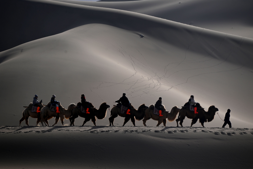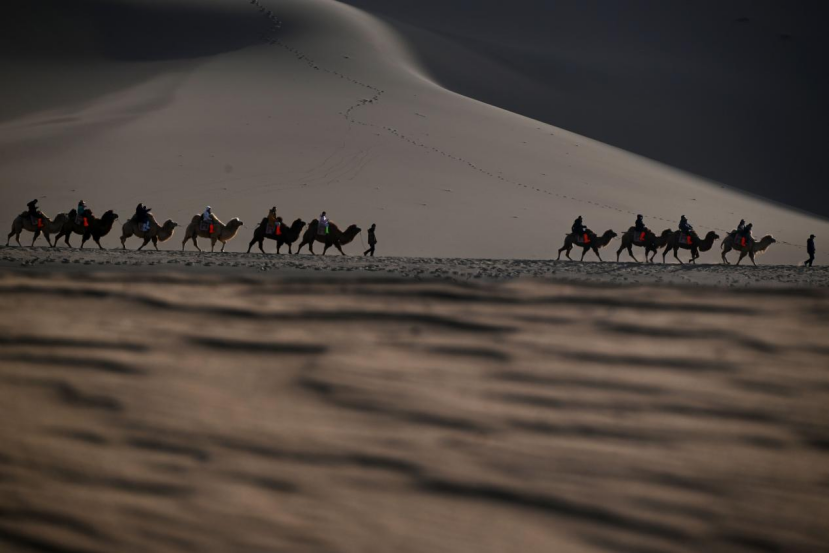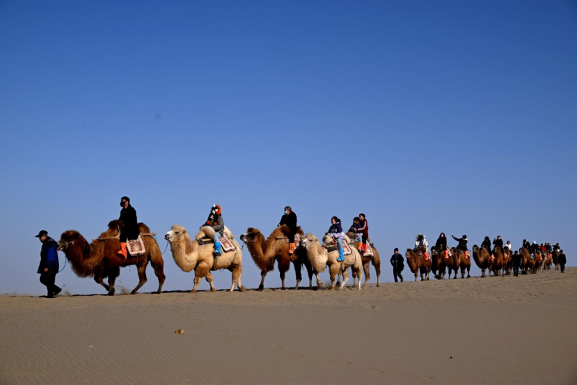 春节将至,甘肃省敦煌市旅游持续升温。游客走进丝路敦煌,欣赏大漠风光,感受文化魅力。(文/图 张晓亮)