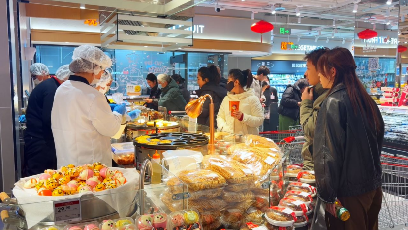 如果说菜市场承载着最鲜活的市井烟火,那么大型超市则为市民提供了“一站式”的采购便利。在国芳综超,米面粮油堆积成垛,生鲜果蔬、零食、品牌礼盒一应俱全,满足市民从日常刚需到走亲访友的多元化采购需求。“今年的囤货量比以往增加了50%,确保广大市民朋友能放心选购。”国芳超市食品主管王俊表示,春节期间超市将持续推出特价优惠,尤其是米面油、肉蛋奶等民生商品,将保持价格稳定。正在选购年货的市民王莉萍说:“快过年了,来超市选购一些家庭必需品和过年礼品。超市很方便,礼品的选择性也广,在这里采购既放心又省心。”