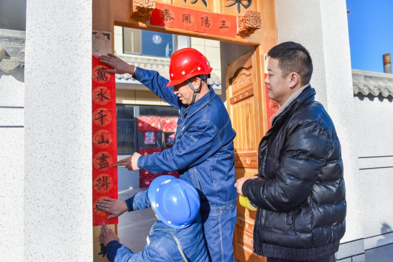 国网定西供电公司组织员工与通渭县平襄镇生态及地质灾害避险搬迁群众一起贴春联、全力以赴确保村民温暖、亮堂过春节。雒兴茹 摄
