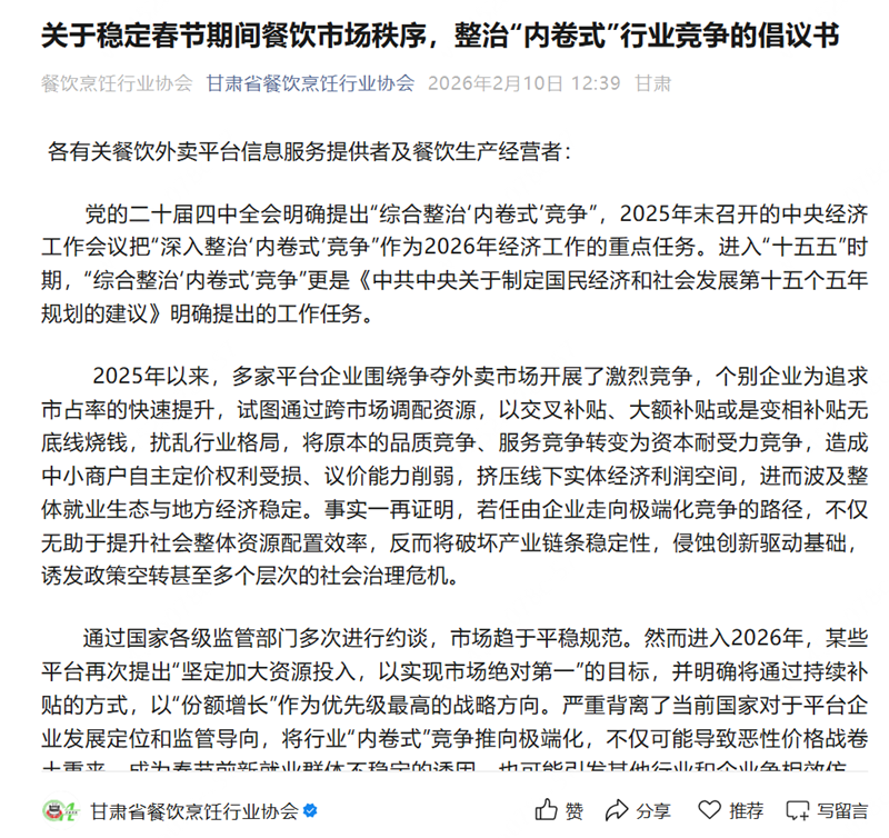 2月10日,甘肃省餐饮烹饪行业协会发布倡议书,呼吁外卖平台及餐饮商家严格落实主体责任,稳定春节期间餐饮市场秩序。