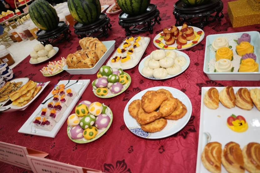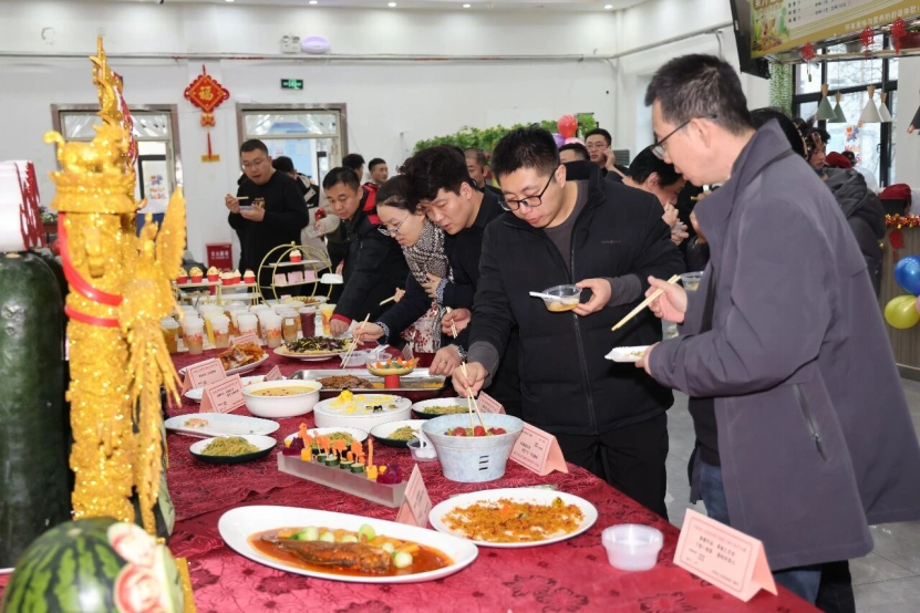 伴随着舞狮、飞天舞等精彩表演,比赛正式开始。赛事设置热菜组、面点组、刀工组、职工业余热菜组四个类别,选手们同台竞技、各展所长。刀工组精准娴熟,面点组巧手匠心,热菜组更是将家常与创意完美结合,既有糖醋黄河大鲤鱼、野生大黄鱼等地方特色,也有金汤小米烩虾、“马上发财”等新颖菜品,兼顾口味、营养与美观,为现场带来一场视觉与味觉的双重享受。